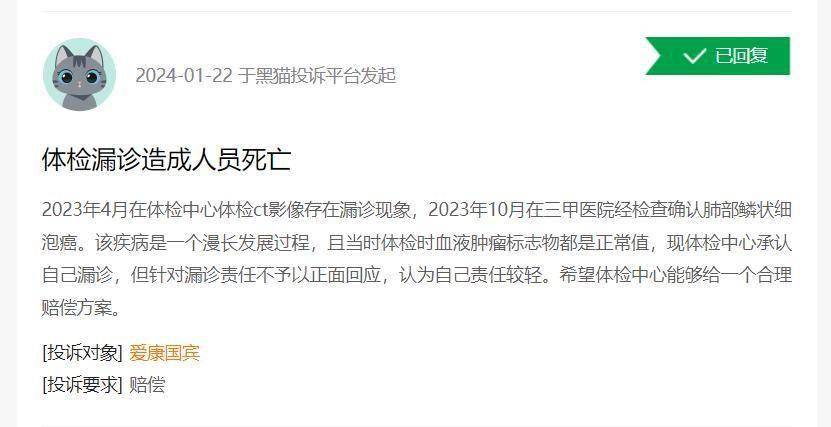 另据黑猫投诉官方平台显示,以“爱康国宾”为关键词的投诉达1240条。其中,有一条“体检漏诊造成人员死亡”【投诉编号:173****0158】的投诉,主要的投诉问题:医生不专业,虚假信息。
