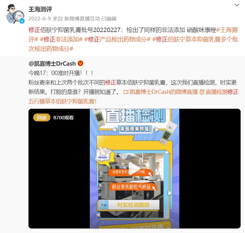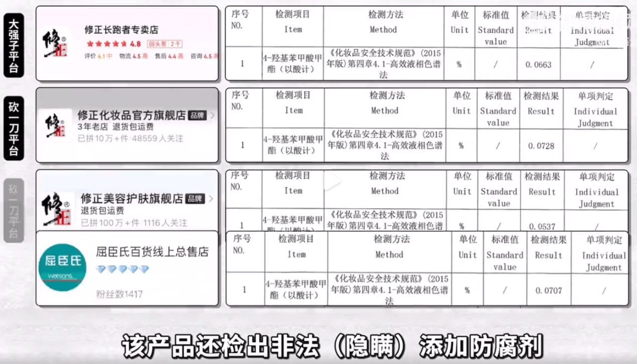 2022年11月7日,王海测评称拼多多和京东平台售卖的修正巧巧紧致美乳霜检出杀菌防腐类成分。