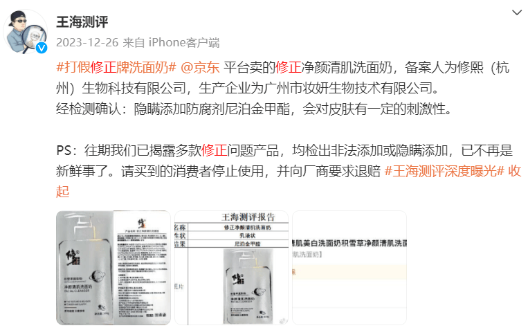 2023年12月26日,王海测评称京东平台售卖的修正净颜清肌洗面奶隐瞒添加防腐剂尼泊金甲酯,会对皮肤有一定的刺激性。
