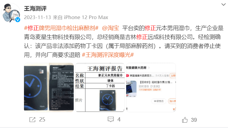 2023年11月13日,王海测评称淘宝平台售卖的修正元本男用湿巾,非法添加药物丁卡因(属于局部麻醉药剂)。