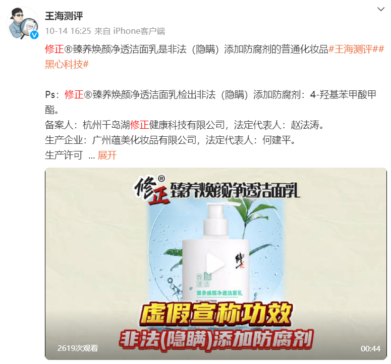 2024年10月14日,王海通过账号“王海测评”发布微博称,修正®臻养焕颜净透洁面乳涉嫌虚假宣传和非法添加隐瞒成分。