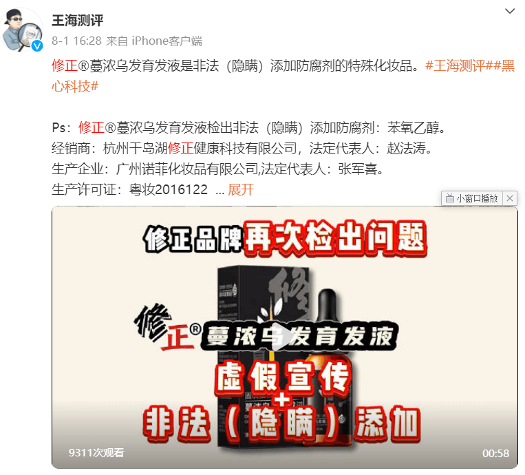 2024年8月1日,王海测评称质疑蔓浓乌发育发液,虚假宣传“快速生发增发”和非法添加隐瞒成分苯氧乙醇。