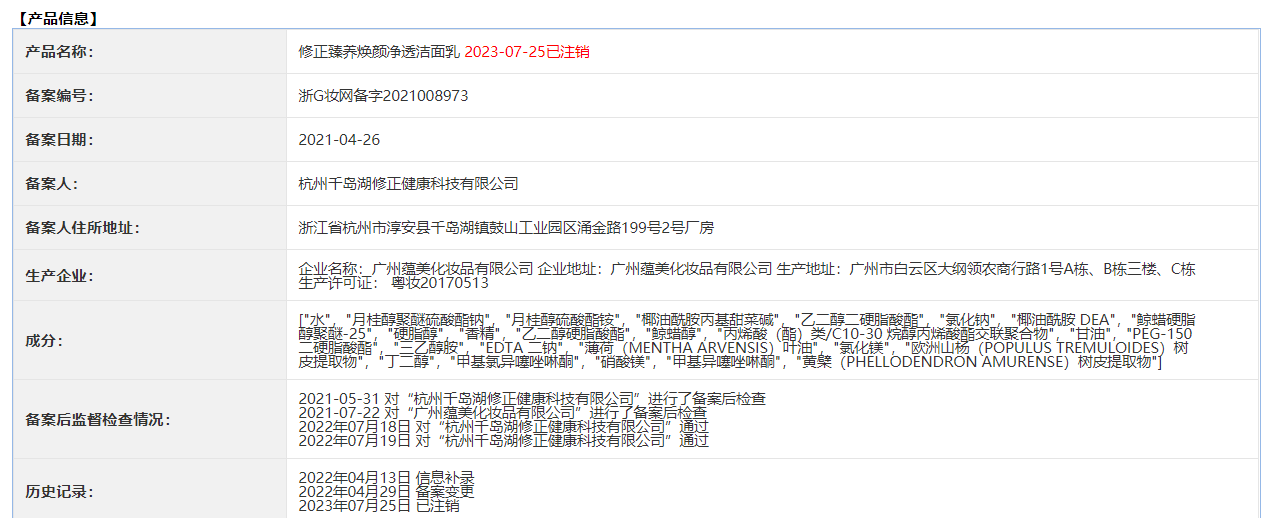 清扬君查询发现,备案编号为浙G妆网备字2021008973修正臻养焕颜净透洁面乳,于2023年7月25日已经注销,其备案功效已经无法搜索。