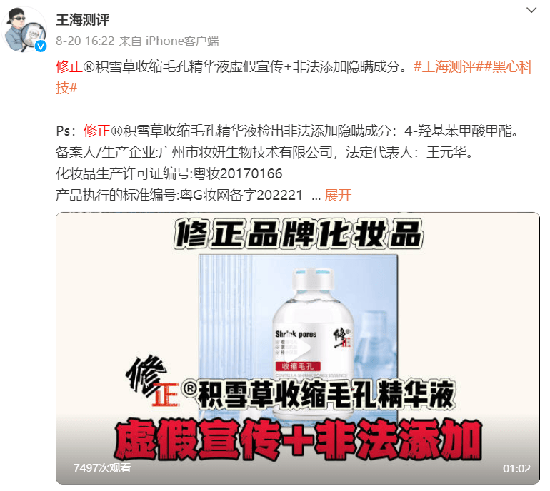 2024年8月20日,王海测评称质疑修正积雪草收缩毛孔精华液,虚假宣传“去除痘痘”和非法添加隐瞒成分4-羟基苯甲酸甲酯。