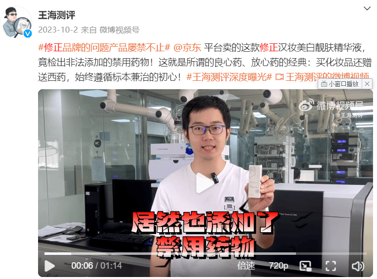 2023年10月2日,王海测评称京东平台售卖的修正汉妆美白靓肤精华液,非法添加禁用药物盐酸萘甲唑啉。