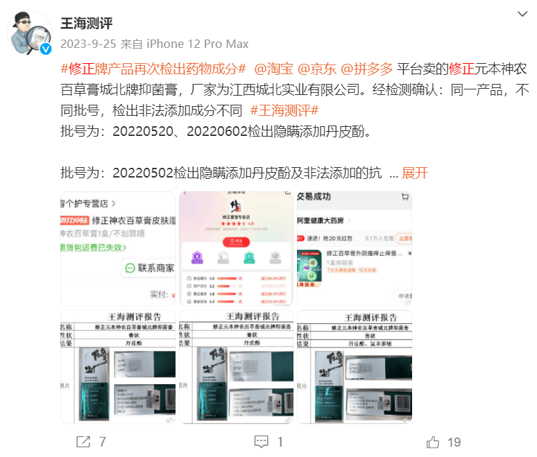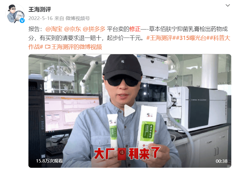 2023年11月16日,王海测评称拼多多平台售卖的修正感喻口舒冷敷凝胶,非法添加抗生素(替硝唑)药物(盐酸萘甲唑啉)。