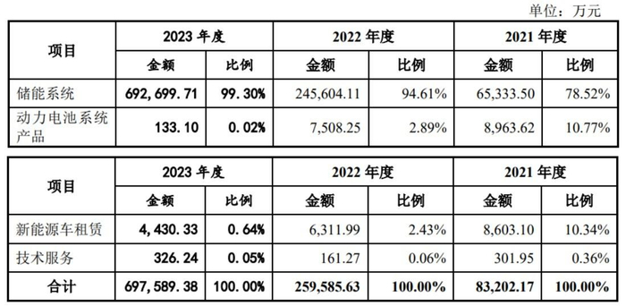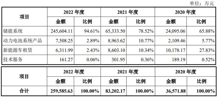 海博思创的储能系统业务步入规模化快速发展阶段,2020年至2022年的收入分别为2.41亿元、6.53亿元和24.56亿元,不仅复合年增长率高达219.27%,占主营业务的比例也得到了显著抬升。
