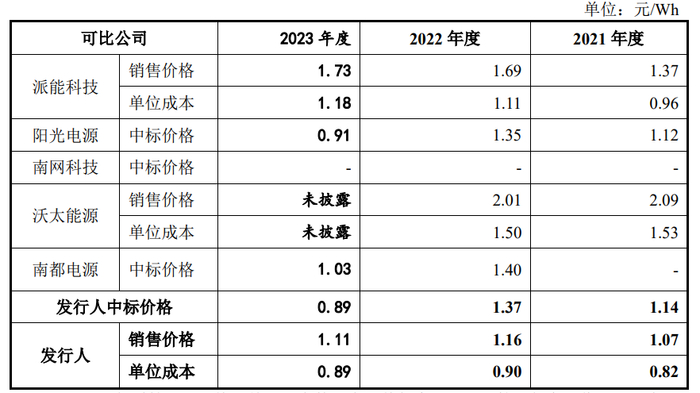 但透过中标价格与采购成本表不难发现,海博思创储能系统产品报告期内的销售价格分别为1.07元/Wh、1.16元/Wh和1.11元/Wh,不仅不及同行业可比公司的同期价格,也明显低于其2020年1.75元/Wh的单价。