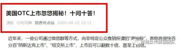 开头我们提到,OTC是没有多大价值的上市流程,为什么这么说呢?公众号“谎言终点站”曾发布过题为“美国OTC上市忽悠揭秘!十问十答”的文章,里面详细的分析了部分非法企业为何选择OTC上市割韭菜的内幕,感兴趣的朋友可以了解一下。