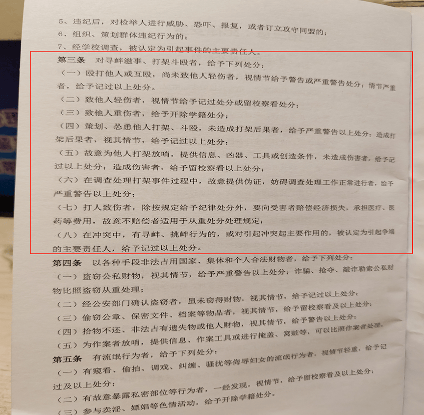 在北外国际IFD学生手册里,第三条记载着对寻衅滋事、打架斗殴者,给予的下列处分: