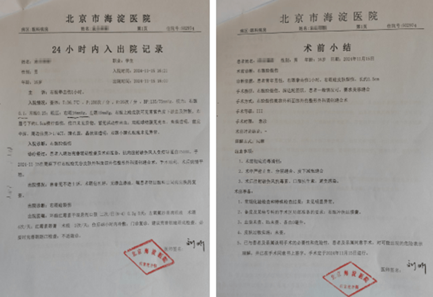 记者在袁先生提供的北京市海淀医院《24小时内入出院记录》以及《术前小结》上了解到,袁先生的儿子小顥因右眼拳击伤1小时于11月15日16:21分入院治疗,入院时右眼上睑皮肤可见青紫色皮下淤血及肿胀,右眉弓下约1.5cm横行裂伤,入院诊断:右眼睑裂伤。
