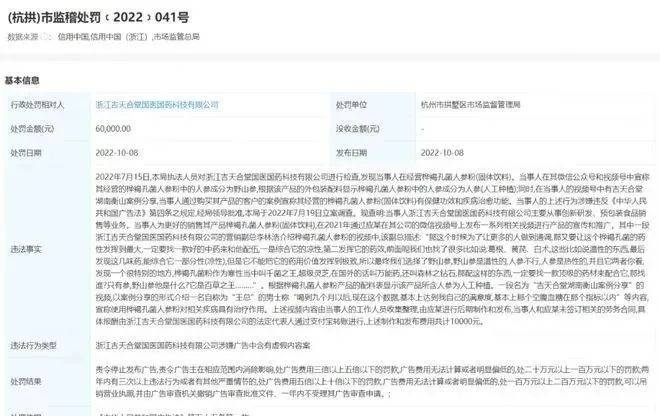 今年10月8日,浙江吉天合堂国医国药科技有限公司因违反《中华人民共和国广告法》第五十五条第一款被杭州市拱墅区市场监督管理局罚款6万元。