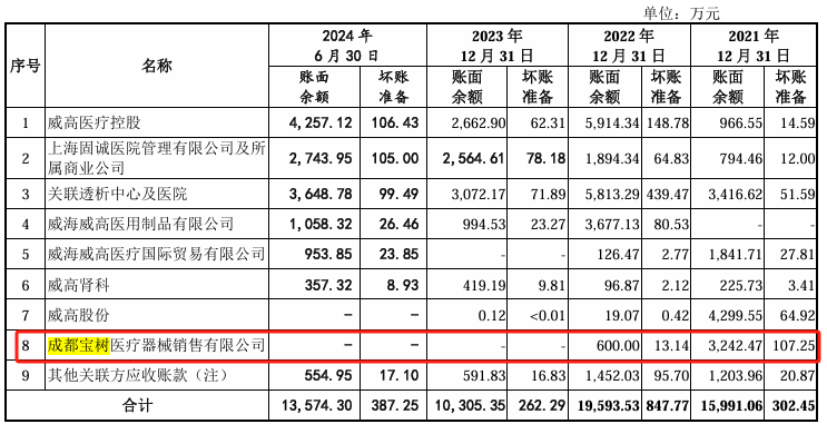 在威高血净的招股书中,除了出现上海宝树以外,还出现了成都宝树。天眼查显示,成都宝树由上海宝树100%持股,且两家公司的法人代表均为姜春生,但该公司已于2024年2月注销。根据招股书,威高血净2022年对成都宝树的应收账款仍有600万元。