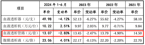 正在推进的PP外壳中空纤维膜血液透析滤过器项目,本质上属于血液透析器产品线的改良升级;其他业务,如营收占比在13%左右的血液透析管路,市场准入门槛相对更低。并且和血液透析器一样,血液透析管路的销售单价,从2021年的14.50元降至13.07元。同期毛利率也从24.80%下滑至18.64%。
