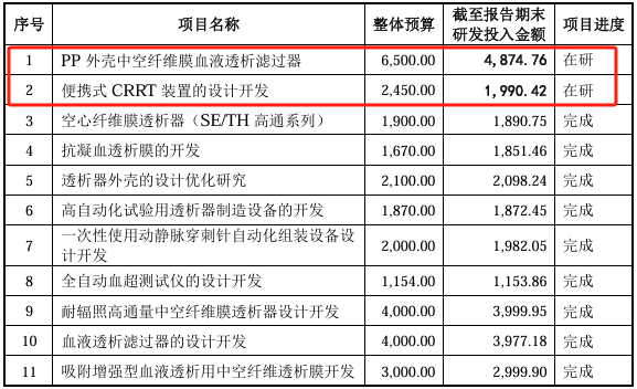 而目前威高血净正在推进的在研项目,主要为PP外壳中空纤维膜血液透析滤过器,以及便携式CRRT装置的设计开发项目。前者属于血液透析器产品线这一主赛道下的耗材类产品;后者属于血液净化设备类产品,主要用于重症监护室患者的连续性血液净化治疗。