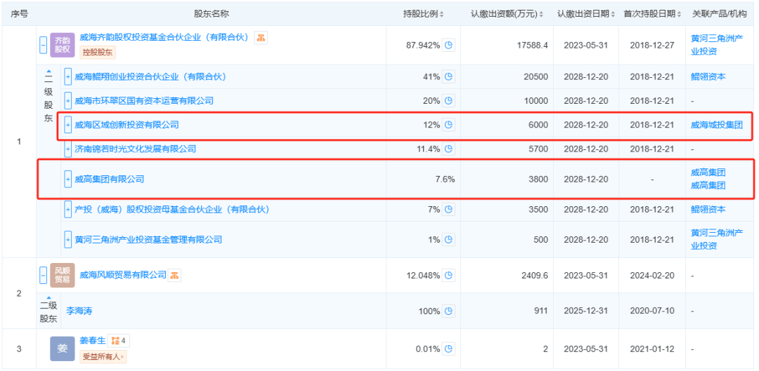 天眼查数据显示,上海宝树注册资本2亿元,公司2023年的员工人数仅为2人。源媒汇通过股权穿透发现,其大股东威海齐韵的二级股东中,不仅有威海当地国资,还出现了威高集团的身影。