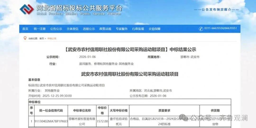 据河北省招标投标公共服务平台提供的信息显示,2026年1月6日,武安市农信社公示采购运动鞋项目的中标结果,中标价格为1572元,中标单位为邯郸市宸杉贸易有限公司。