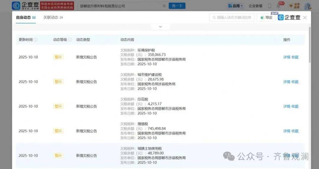 企查查显示,上述新材料公司2025年10月被国家税务总局涉县税务局通报欠税,涉及环境保护税、城市维护建设税、城镇土地使用税等多个税种,欠税余额达118.52万元。