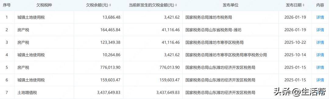 另外潍坊经济区城市建设投资发展集团有限公司,还设涉及多项欠税信息,涵盖房产税、城镇土地使用税、土地增值税等,经过粗略结算合计欠税余额约为468.5万元。
