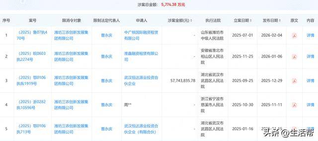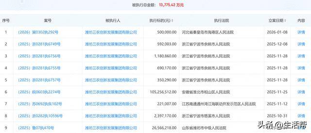 同时还涉及一项股权冻结,被执行人为潍坊三农创新发展集团有限公司,被冻结的股权数额12亿元,冻结起止日期为2026年1月7日至2029年1月6日。